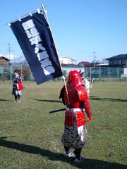指定された場所で甲冑に着替えたのですが、なにしろ自分で着るのは初めて(笑)なので戸惑う。やむなく他の自前甲冑の方に手伝ってもらう。