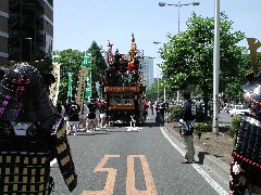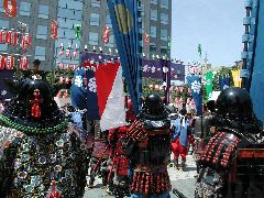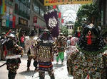 歩道よりを行進している自前甲冑の一人が、アドリブで歩道上の観客を湧かせている。