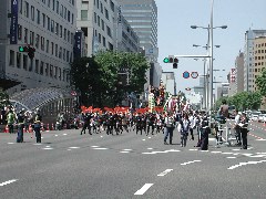 いよいよ武者達は東二番丁通りに並びました。すでに、神輿渡御、山鉾巡行、すずめ踊り大流しは出発しています。このために、普段は交通量の多い東二番丁通の北行き車線は通行止めになっています。この通りは片側4車線あるので、一般参加の武者が横に7人、その後ろに仙台市5区の武者が横一列に並んでも余裕があります。某はここぞとばかり、普段は絶対歩けない中央分離帯側を歩くことにしました。