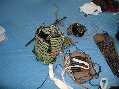 ところが、自分の着る甲冑がどこにあるのか分からずに、時間だけが過ぎていく…と思ったら装飾担当の人が来て、「今日あなたが着るのは、あちらの緑の甲冑です。(仙台市の)5区の着付けが終わったら着付けをするので、靴下を履いて待っていて下さい」見れば、想像以上に豪華な蓬色の甲冑がありました。